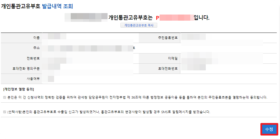 만약 휴대폰 앱으로 신청이 어렵다면 PC로 관세청 홈페이지 조회를 진행하여 본인인증 후 발급내용 조회에서 수정 버튼을 통하여 이동한 다음 화면에서 꼭 재발급을 체크 후에 저장 버튼을 클릭하면 재발급 신청이 완료됩니다. 아래 이미지 따라서 진행하시면 무리 없이 진행할 수 있습니다.