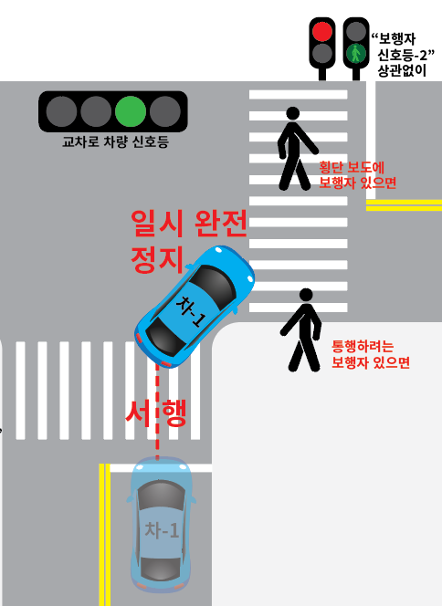 주목해야 할 점이 있습니다. 교차로 차량 신호등이 적색으로 "차-1"이 일시 정지후 통행자 없으니 서행해서 지나간후 뒤 따라오는 "차-2"도 무조건 완전 일시 정지 후 통행자 유무를 확인하시고 없을 시 지나가야 합니다. "차-1" 뒤에 따라오는 차가 10대든 100대든 무조건 모두 일시 정지 후 서행해야 합니다. 꼭 기억하셔야 합니다. 이것을 잘 몰라서 최근 벌점 가장 많이 받는 이유이기도 합니다.